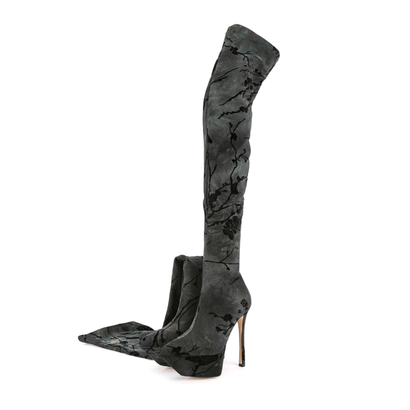 Black Flowers Printed Pointed Toe Platform Heels Thing-high Long Boots