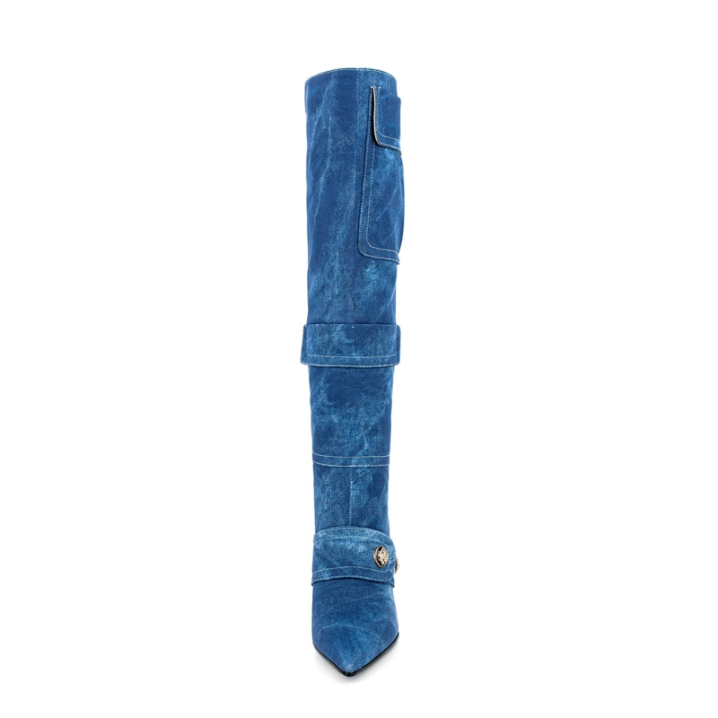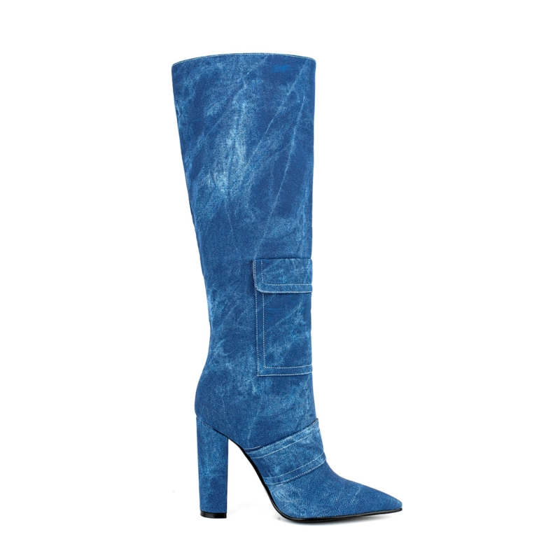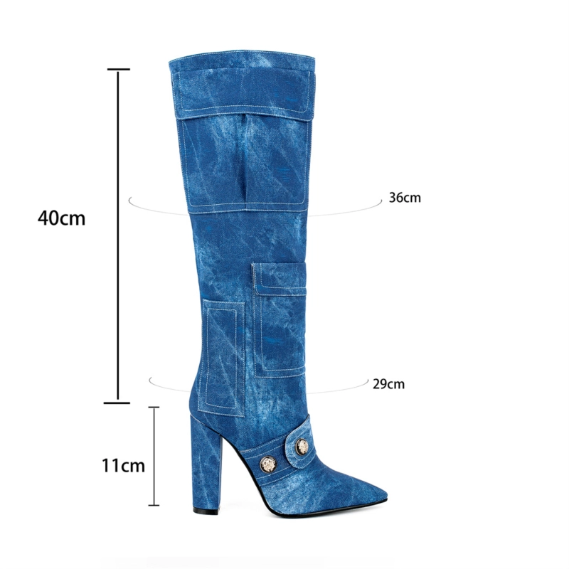 Blue Denim Pointed Toe Chunky Heel Pocket Knee High Boots