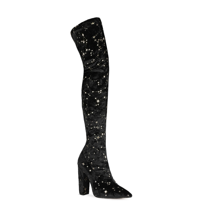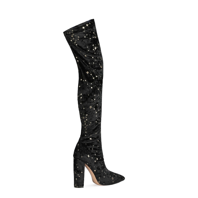 These women’s thigh high velvet boots certainly have a lot to offer women. As well as providing warmth in the colder months, these star embossed ladies heeled booties are also seriously chic and surprisingly versatile.