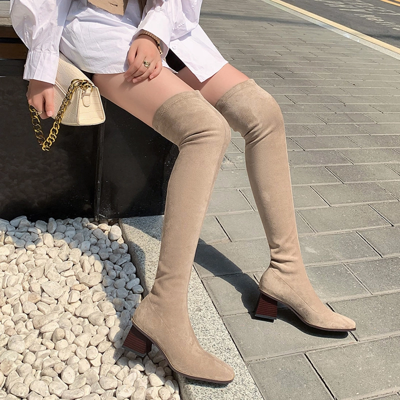 While some stretch elastic thigh high boots are classic and luxe, other elastic stretches over the knee boots are whimsical and over-the-top, making the block heel over the knee boots a perfect canvas for you.