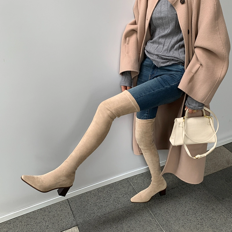 Don’t forget the dress & suede fabric pointed toe elastic thigh high boots combo. This is definitely a daring winter style, but we’ re here for it, a ideal women over the knee heels.