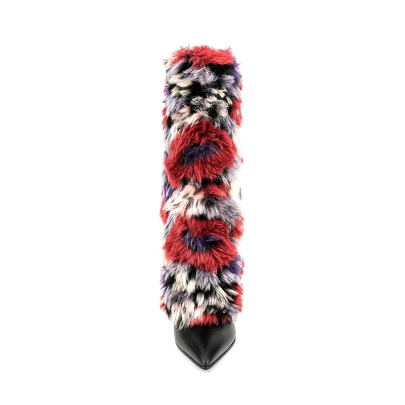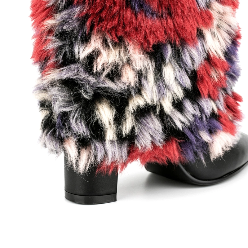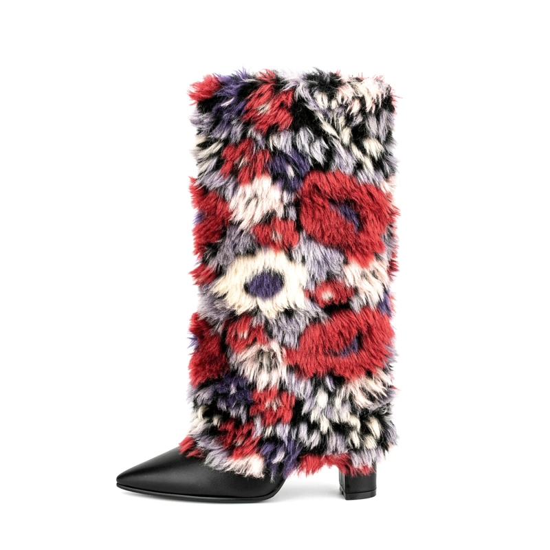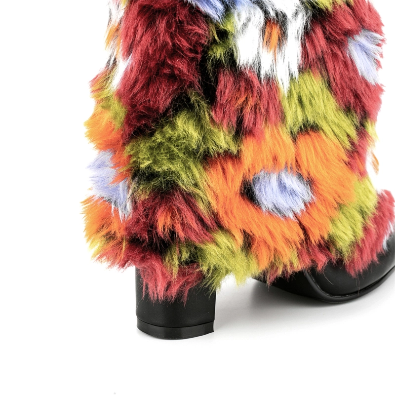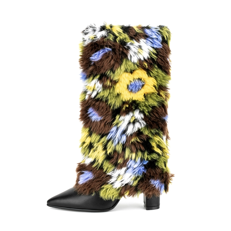 Women’s Multicolor Furry Pointed Toe Chunky Heel Knee High Boots