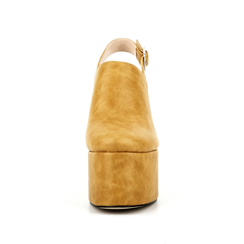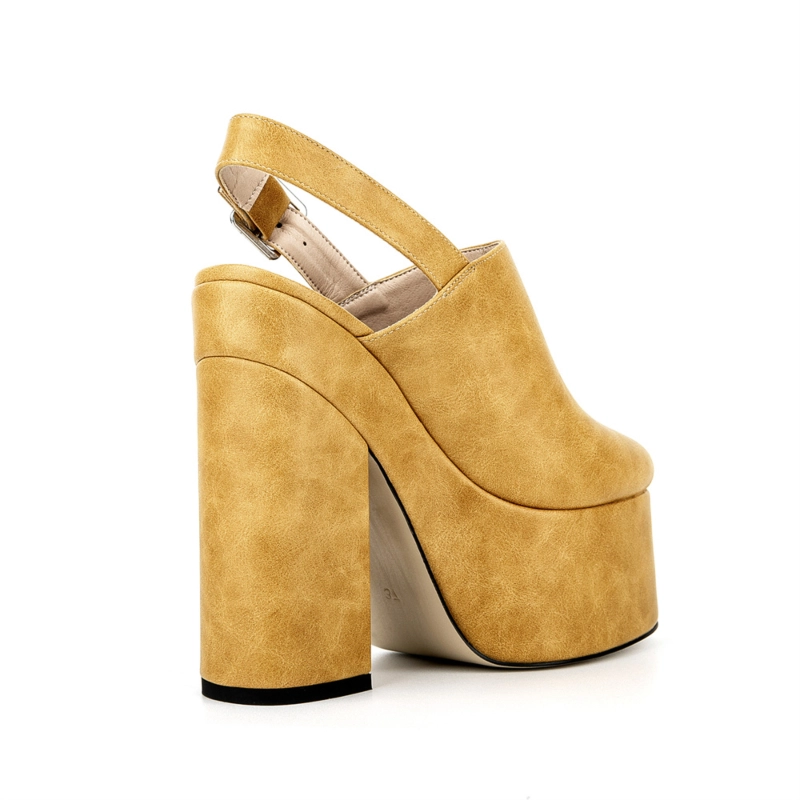 Yellow Vegan Leather Round Toe Platform Heels Block Heel Slingback Shoes